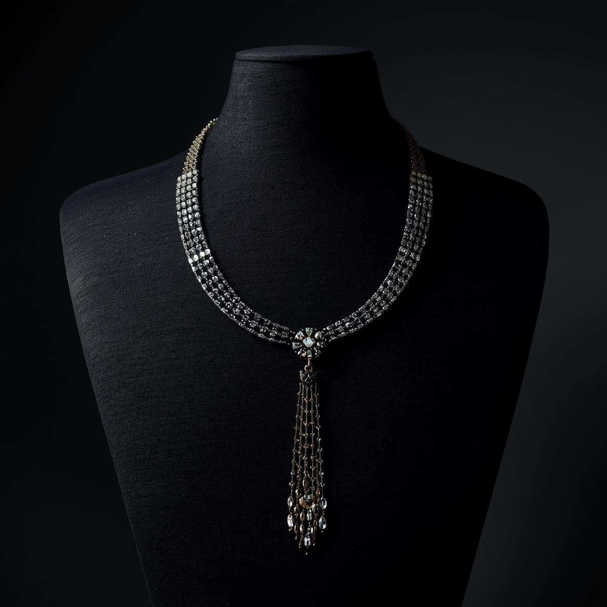 This necklace features a unique “antique” oxidized finish that is very trendy right now. It has a multi-strand chain that connects to a central floral design. The highlight is the long, elegant tassel made of hanging chains and dark crystals that sways when you move. It is an excellent choice for wearing with sarees or evening gowns at parties.